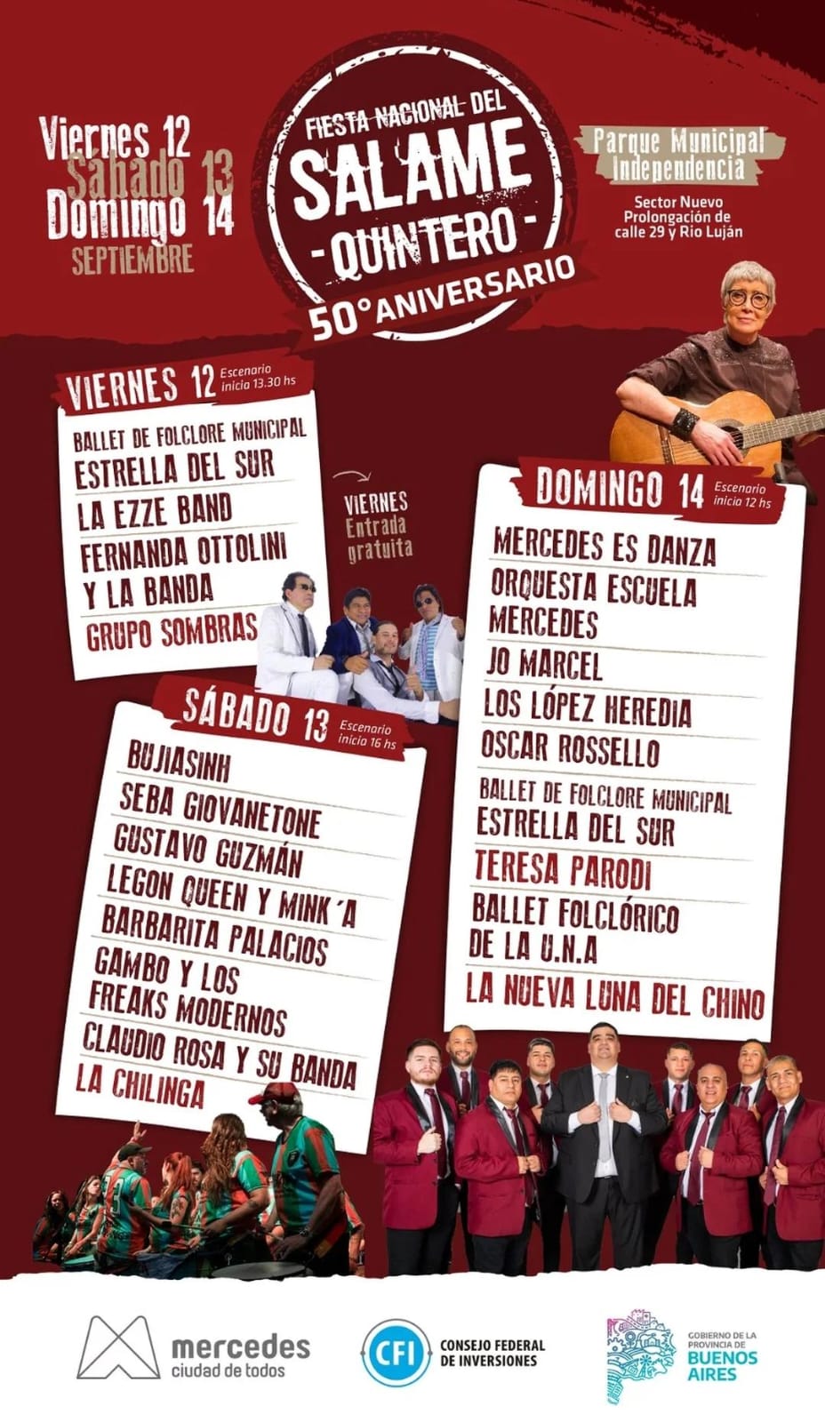 Finalmente se conoció la grilla de artistas que participarán en la 50ª Fiesta Nacional del Salame Quintero. El evento contará con la participación de figuras destacadas como la cantautora Teresa Parodi y la banda de cumbia La Nueva Luna, junto a otros artistas nacionales y locales.