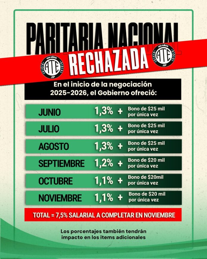 El ofrecimiento contempla incrementos mensuales de apenas 1,3% para los próximos meses junto con bonos remunerativos de entre $20.000 y $25.000, por ello fue calificado por el gremio como “inadmisible” y “una falta de respeto al conjunto de los trabajadores públicos”.