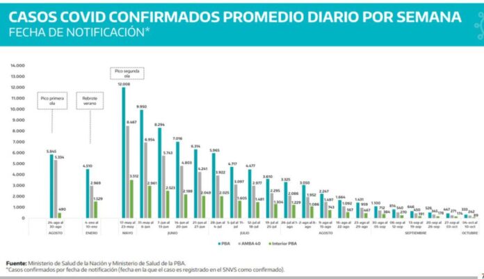 En promedio, apenas se registraron 333 casos diarios, un 25% menos que los números de la semana anterior. La cifra en el interior bonaerense fue de 90 casos por día.