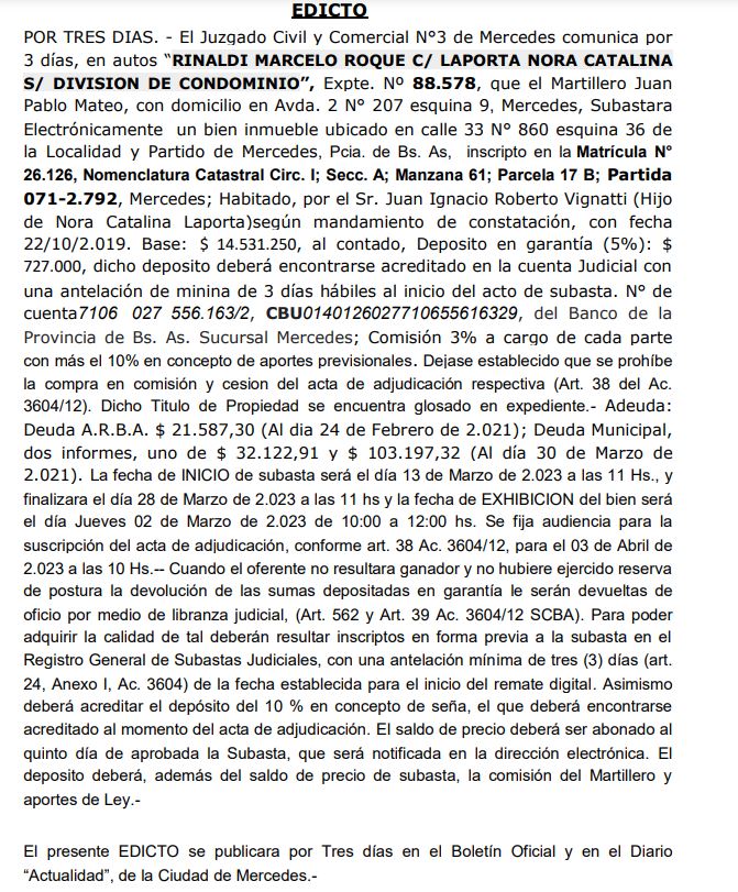 EDICTO “RINALDI MARCELO ROQUE C/ LAPORTA NORA CATALINA S/ DIVISION DE CONDOMINIO” Por redaccion - 23 febrero, 2023 0 8790
