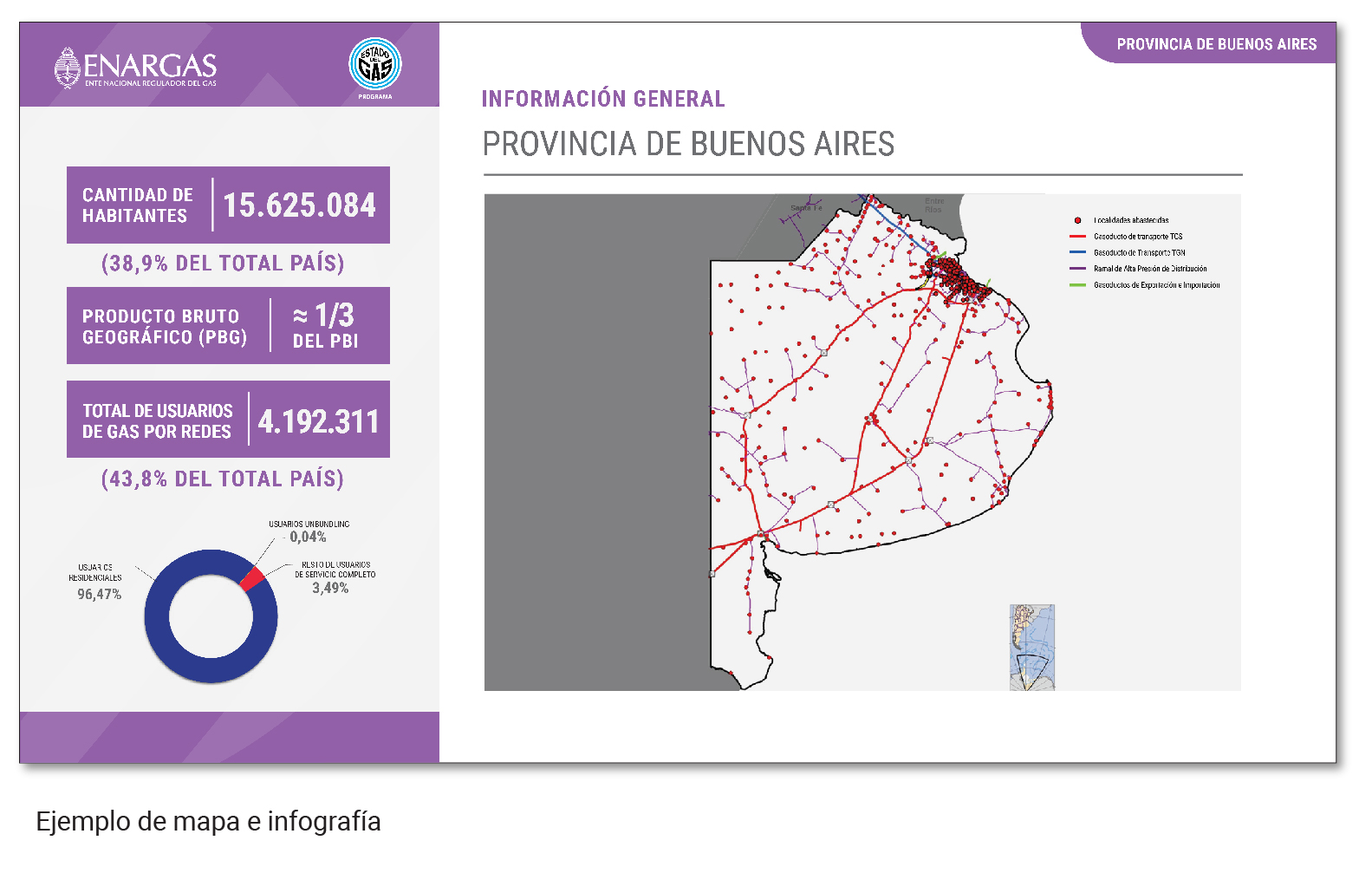 El Ente Nacional Regulador del Gas (ENARGAS) informa que pone a disposición de la ciudadanía una nueva serie de los Informes Provinciales, en la que se incorporan los datos relevados durante 2021. En esta ocasión la presentación corresponde a la provincia de Buenos Aires, en la que se detallan las características actuales de la jurisdicción respecto de la evolución del servicio público de gas por redes.
