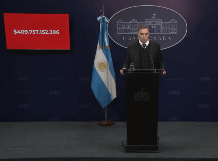 El vocero presidencial, Manuel Adorni, puso una pantalla que mostraba en tiempo real la supuesta deuda que tiene la Provincia con los hospitales del SAMIC.