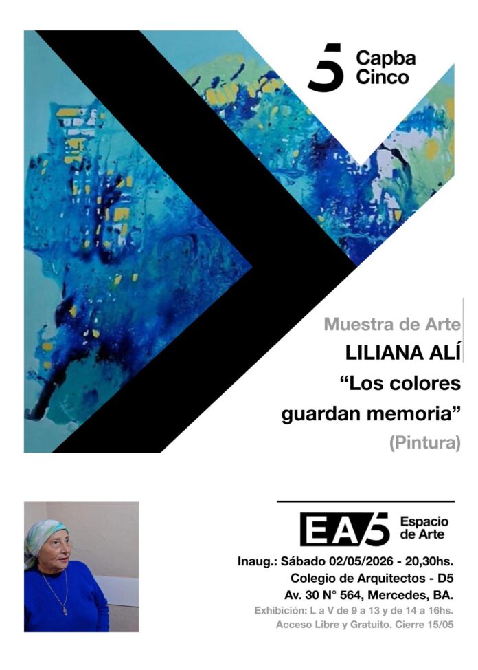 El próximo sábado 2 de mayo de 2026, a las 20:30 horas, se inaugurará la muestra de arte “Los colores guardan memoria”, de la artista Liliana Alí, en el Espacio de Arte EA5 del Colegio de Arquitectos de la Provincia de Buenos Aires – Distrito 5, Av. 30 Nº 564 de la ciudad de Mercedes.