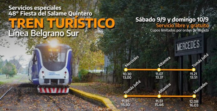 Trenes Argentinos informó que este sábado 9 de septiembre sumarán frecuencias especiales en el Tren Belgrano Sur, para que todas las personas que quieran ir a la Fiesta del Salame Quintero, una de las grandes citas gastronómicas de la Argentina, puedan hacer el viaje de manera gratuita.