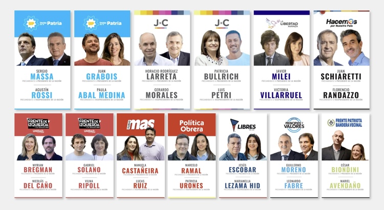 - Unión por la Patria: si bien Sergio Massa fue ungido y presentado como candidato presidencial «de unidad» dentro del oficialismo, Juan Grabois anunció que participará en las elecciones primarias del 13 de agosto dentro del espacio.