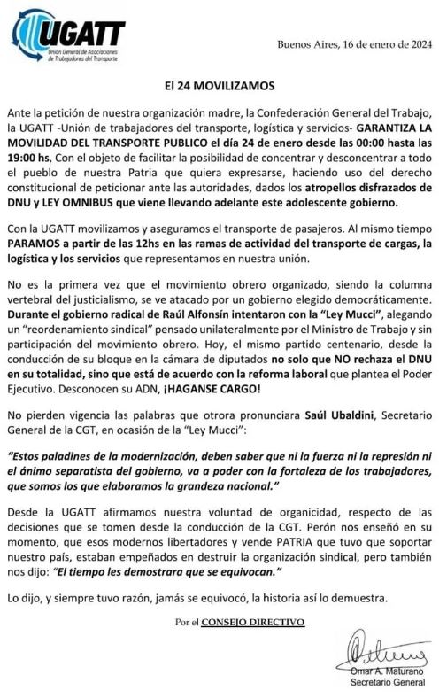 «Con la UGATT movilizamos y aseguramos el transporte de pasajeros», señalaron. En ese plano, confirmaron que sí habrá paro a partir de las 12 horas en las ramas de actividad del transporte de cargas, la logística y los servicios que representan.