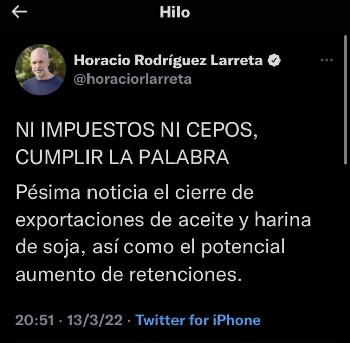 Pésima noticia el cierre de exportaciones de aceite y harina de soja, así como el potencial aumento de retenciones. Solo diez días después de haber prometido que no harían nada de esto, el gobierno demuestra que su palabra no tiene valor y hace exactamente lo mismo que dijo que no iba a hacer.