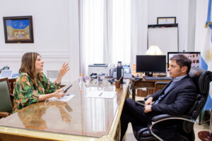 El gobernador Axel Kicillof se reunió este lunes con la ministra de Ambiente, Daniela Vilar, y con la presidenta del Instituto Cultural, Florencia Saintout, para realizar un seguimiento de la gestión y analizar los avances alcanzados en materia de coordinación entre los distintos niveles del Estado con el objeto de acelerar la puesta en marcha y la implementación de las políticas públicas de cada cartera.