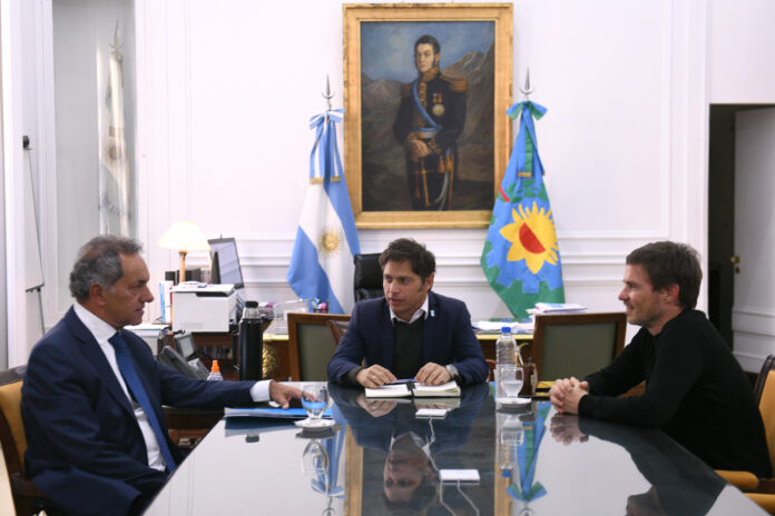 El gobernador Axel Kicillof se reunió este jueves en Casa de Gobierno con el flamante ministro de Desarrollo Productivo, Daniel Scioli, y su par bonaerense de Producción, Ciencia e Innovación Tecnológica, Augusto Costa, para abordar la agenda de trabajo conjunto y profundizar políticas para fomentar el desarrollo productivo.