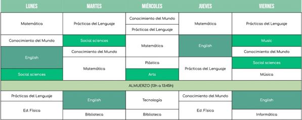 Ejemplo de un cronograma escolar de un alumno de primer ciclo del Nivel Primario de una escuela bilingüe de gestión estatal: