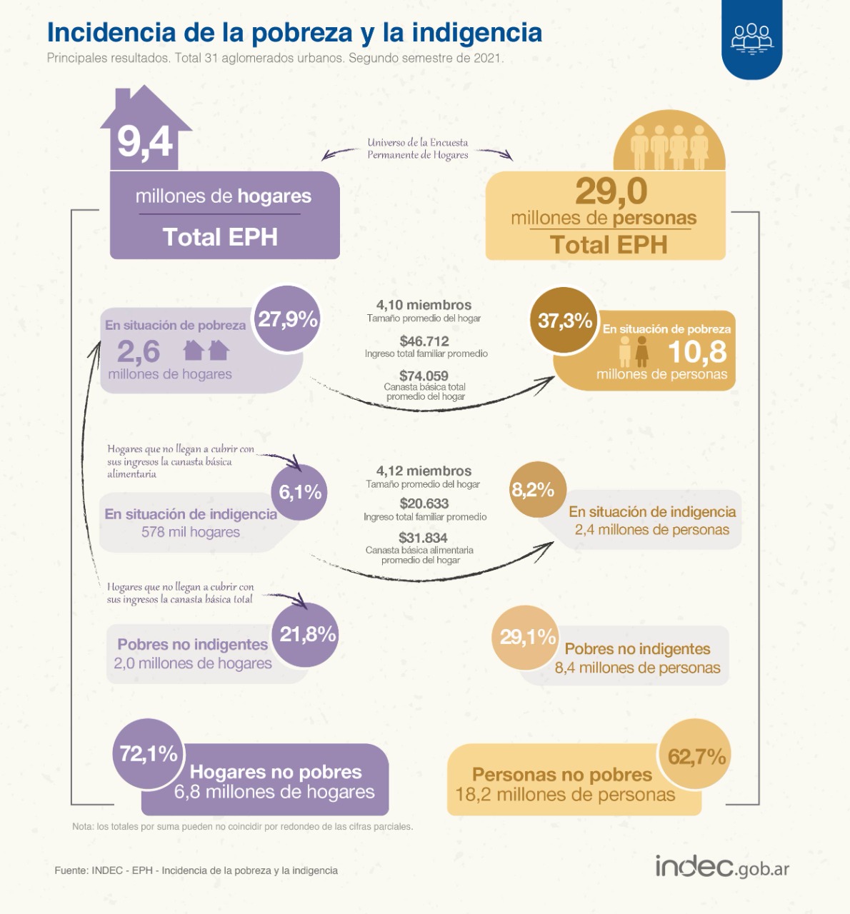 El Instituto Nacional de Estadísticas y Censos (Indec) informó este miércoles que el 37,3% de la población argentina se encuentra bajo la línea de pobreza y el 8,2% bajo condiciones de indigencia, de acuerdo a los datos del segundo semestre de 2021.