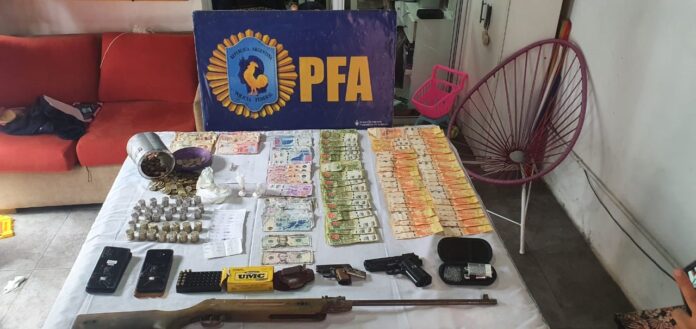 Con las pruebas aportadas por los detectives, el Juzgado de Garantías N°1 del Departamento Judicial Mercedes a cargo del Dr. Marcelo Romero ordenó el allanamiento a la finca donde se logró la detención de un hombre y además se secuestraron más de 50 dosis de cocaína, 80.000 pesos, 25 dólares, 1 Pistola semiautomática calibre 25, 1 Rifle y 1 Pistola de accionamiento a gas comprimido, varias municiones y 2 teléfonos celulares.