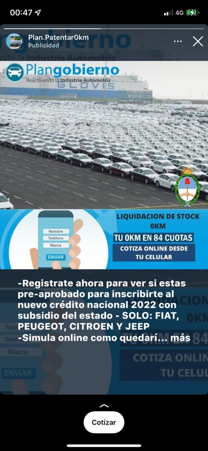 Se constató que la empresa de referencia, mediante sus redes sociales Facebook e Instagram, publicita anuncios de presuntas empresas privadas donde se ofrecen “planes de ahorro” a fin de adquirir vehículos automotores, con la apariencia de supuestos planes oficiales incluyendo denominaciones como “PLAN NACIONAL”, “PLANES ARGENTINOS”, “PLAN GOBIERNO”, “PRECIOS CUIDADOS de AUTOS” y/o “PROCREAUTO.