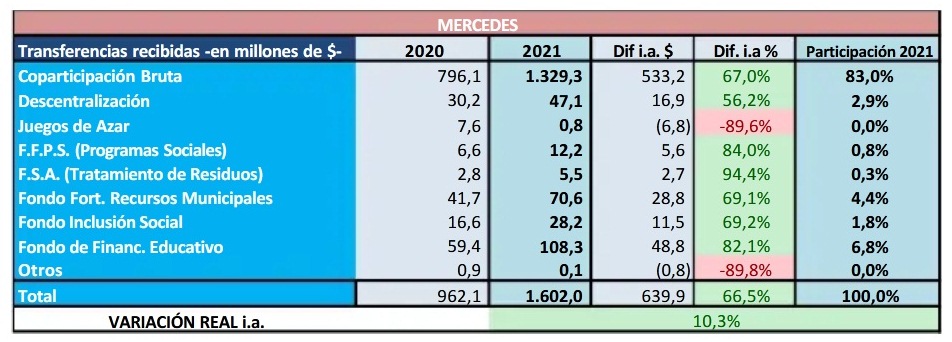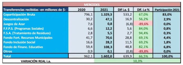 Más a mitad de tabla se encuentra Mercedes, en el puesto 78, que recibió de coparticipación 1.601.976.407,49 pesos en el 2021, lo que representa el 0,6% de lo transferido a la totalidad de los municipios de la provincia. En el reparto per cápita, basado en una población de 68.165 mercedinos, nuestro distrito recibió 23.501,45 pesos por habitante.