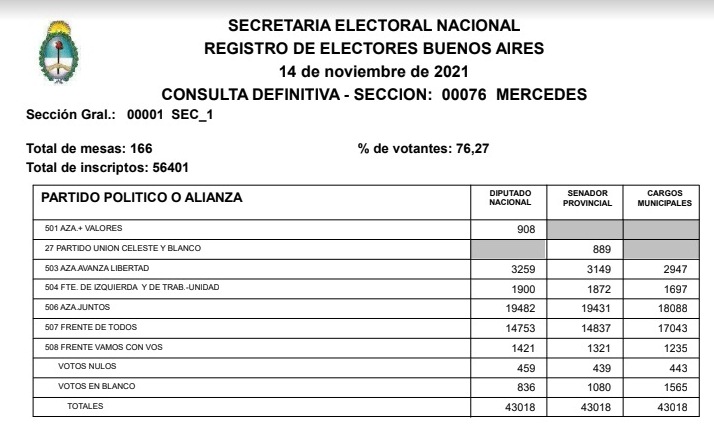 En tanto la Alianza Más Valores no logró superar el piso (logró 263.515 votos) y se registraron 103.730 votos nulos y 291.580 en blanco.