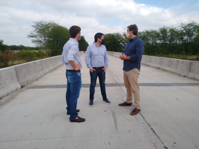 El intendente Juan Ignacio Ustarroz junto a su par de Luján, Leonardo Boto, y el ministro de Infraestructura y Servicios Públicos de la Provincia, Leonardo Nardini, recorrieron la obra del puente que une las localidades de Olivera y Goldney, donde ya se habilitó el tránsito vehicular.