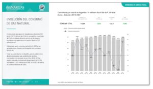 La publicación cuenta con 19 gráficos, y sus correspondientes explicaciones, en los que se analizan diferentes variables. Entre las presentaciones relacionadas con la demanda se pueden resaltar “Evolución del consumo de gas natural”, que expone cómo fue variando el total de los volúmenes de gas natural consumidos, en millones de m3/día, de enero a diciembre de cada año desde el 2010 y “Actividad económica y consumo de gas”, en la que se realiza una comparación entre las variaciones mensuales interanuales del consumo de gas natural y del Estimador Mensual de la Actividad Económica (EMAE), publicado por el Instituto Nacional de Estadística y Censos (INDEC) a lo largo del período 2016-2021.