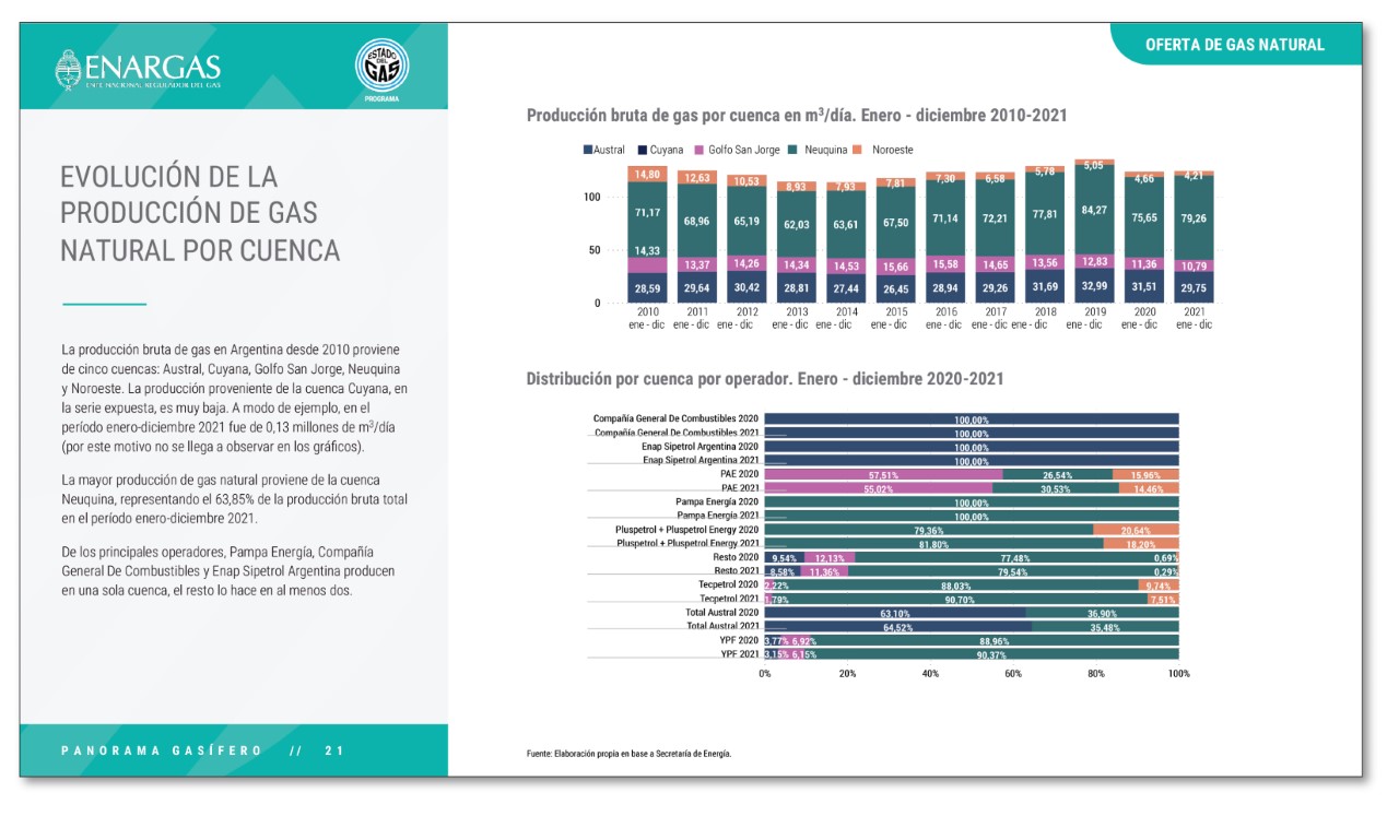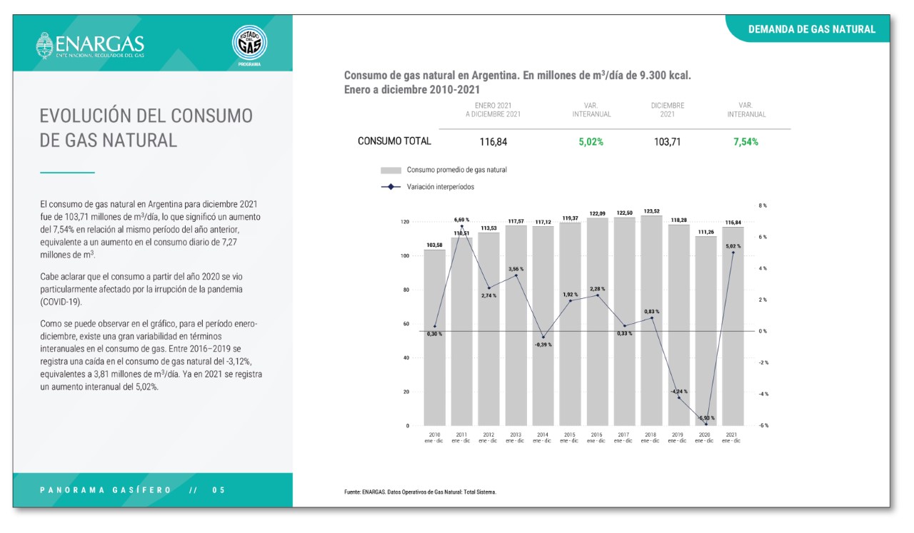 El Ente Nacional Regulador del Gas (ENARGAS) informa que se encuentra a disposición de la ciudadanía una nueva entrega del “Panorama Gasífero” correspondiente al mes de diciembre de 2021. Este informe tiene como objetivo analizar este sector desde una perspectiva general y en vinculación con variables macroeconómicas.